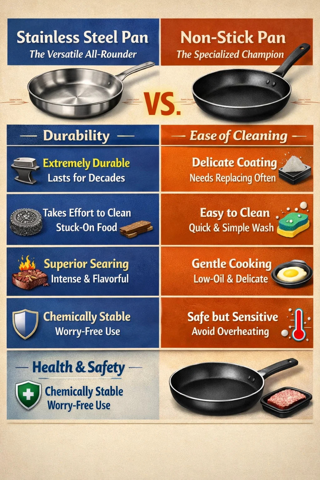 스테인리스 스틸 팬: 이 소재는 매우 안정적이며 음식과 화학적으로 반응하지 않습니다. 토마토 소스 등 산성 음식을 조리할 때도 전혀 걱정할 필요가 없습니다. 붙지 않는 팬: 유명 브랜드의 최신 붙지 않는 조리기구는 매일 사용하기에 매우 안전합니다. 하지만, 과열되면 코팅이 벗겨지거나 냄새가 날까 심리적으로 걱정된다면 스테인리스 스틸을 사용하는 것이 더 안심할 수 있습니다.