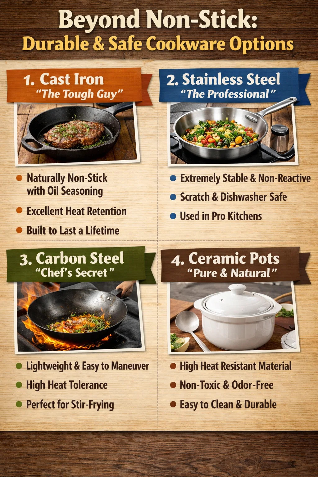 모던하면서도 달라붙지 않는 조리기구 일반적인 사용 시 안전합니다. 코팅 벗겨짐이나 고온 문제에 대한 걱정 없이 완전히 걱정할 필요가 없는 조리기구를 찾고 있다면 실제로 더 강력하고 신뢰할 수 있는 대안이 몇 가지 있습니다.