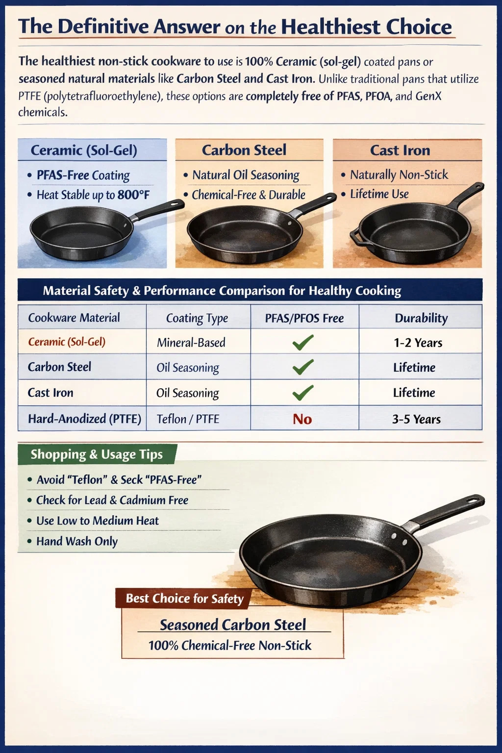 가장 건강한 달라붙지 않는 조리기구 사용하는 것은 100% 세라믹(졸겔) 코팅 팬 또는 탄소강, 주철 등 천연 조미료 소재 . PTFE(폴리테트라플루오로에틸렌)를 사용하는 기존 팬과 달리 이러한 옵션에는 PFAS, PFOA 및 GenX 화학 물질이 전혀 없습니다. 타는 듯한 온도에서도 화학적 위험이 전혀 없는 가장 안전한 프로필을 원하는 사람들을 위해, 노련한 탄소강 열과 중합된 식물성 오일만을 사용하여 물리적인 들러붙지 않는 장벽을 만들기 때문에 최고의 선택입니다.