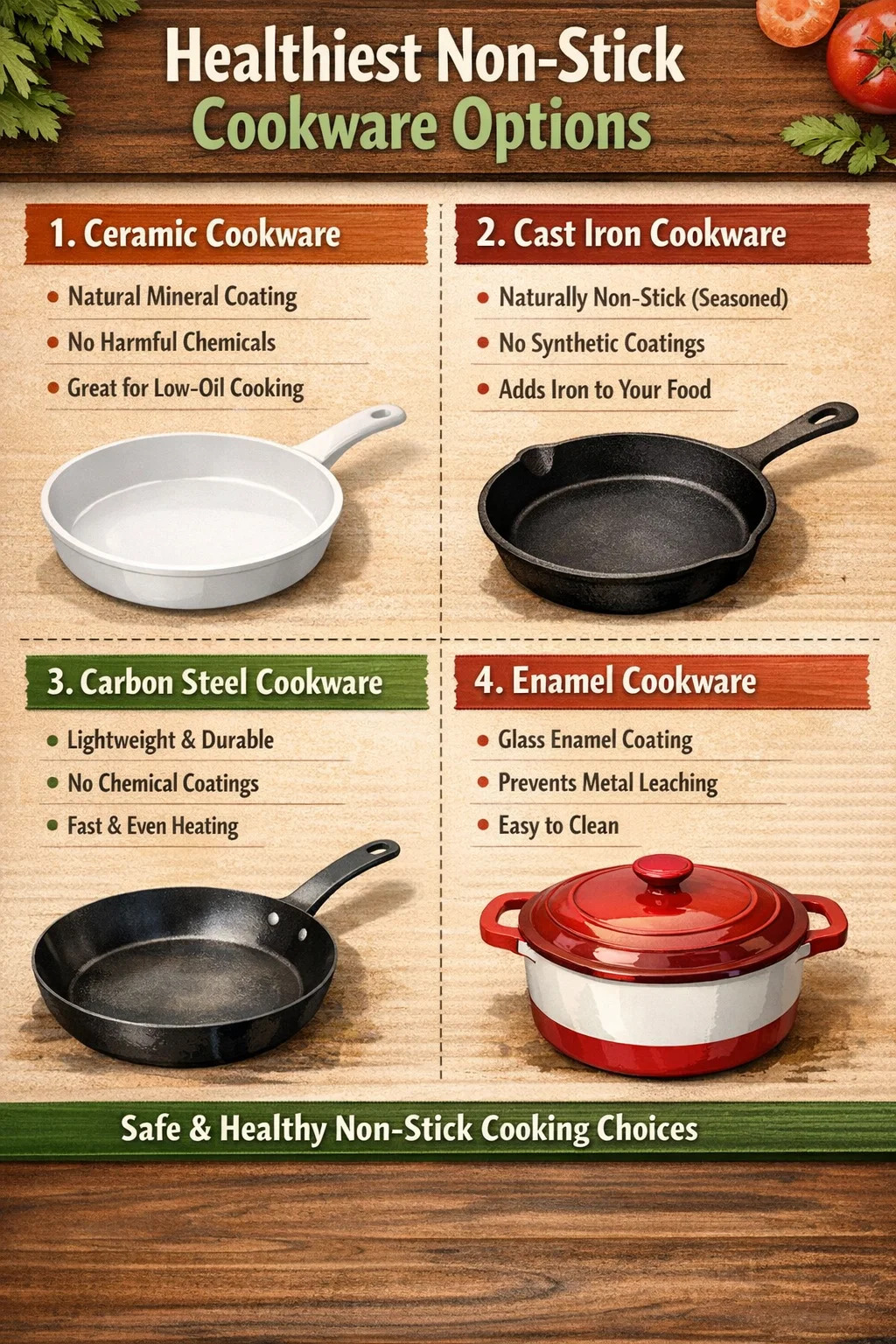 다음은 가장 건강에 좋은 것으로 널리 알려진 몇 가지 유형의 붙지 않는 조리기구에 대한 자세한 소개입니다.
