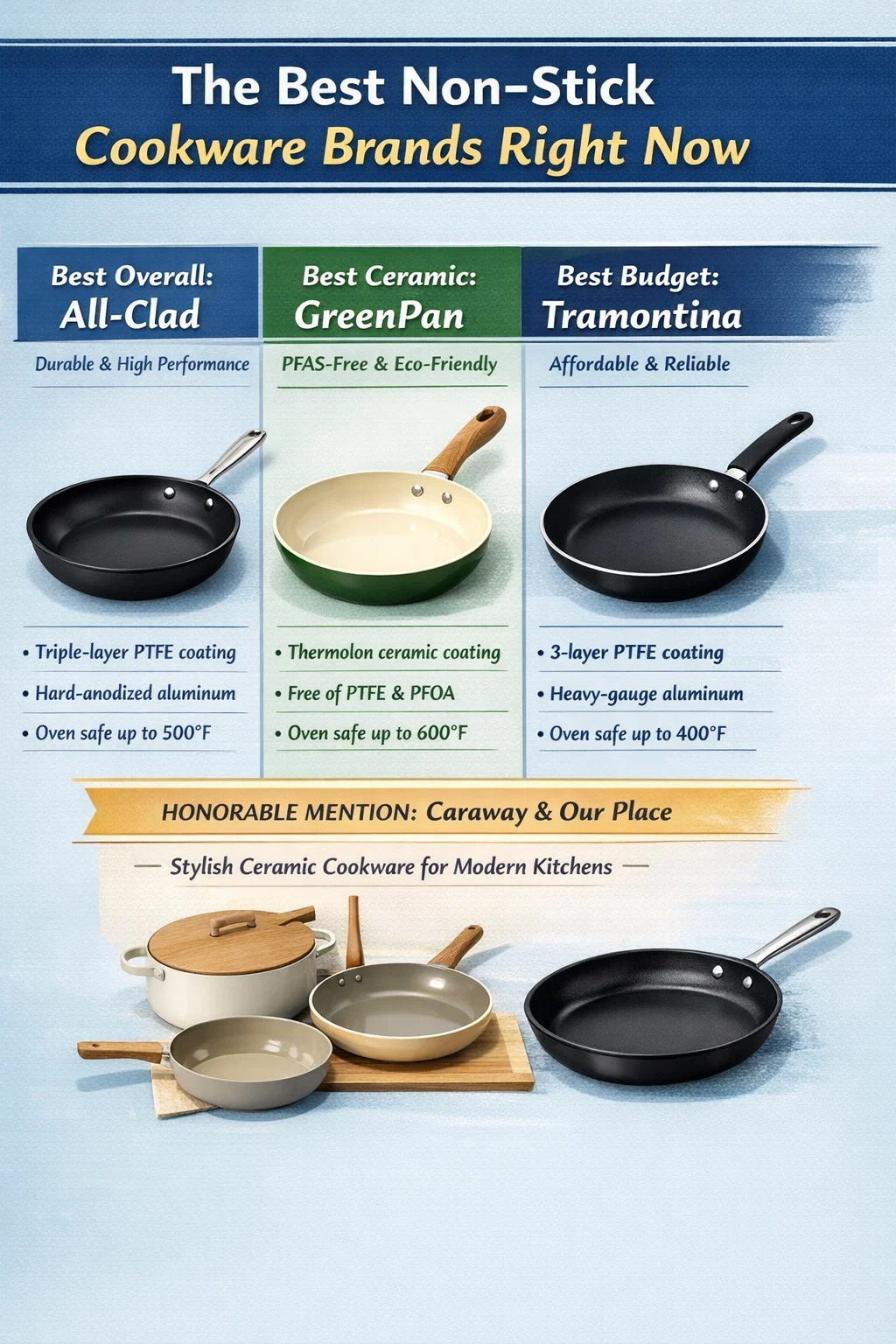- 들러붙지 않는 최고의 조리기구 브랜드: 올클래드(All-Clad) — 가정에서 요리하는 사람들을 위한 내구성, 열 성능, 장기적 가치의 최고의 균형을 이룬 제품입니다.